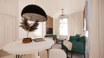 The building is currently rented out for a "KOOPS" shop and a restaurant, generating a monthly rent of EUR 1,255. The hotel will soon be rented out as apartments and rooms oriented to the demand for affordable housing in Vievis and Vilnius’ municipal district. An example of interior refurbishment is shown in the visualizations.