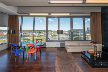 The apartment of 126.71 m² is located on the 15th floor with an excellent view of all the main sites of Vilnius. This fully furnished apartment will be rented for long-term and is just a few minutes walk from the Parliament of the Republic of Lithuania.